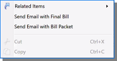 The View Final Bill Transactions Inquiry option is a related item that allows you to send Final Bills associated with a selected row. You can use the email service by highlightinga Bill Deposit Detail line and right clicking to display the Related Items. If multiple rows are selected, each document opens in a separate tab. See Email Configuration for more information about the email service.